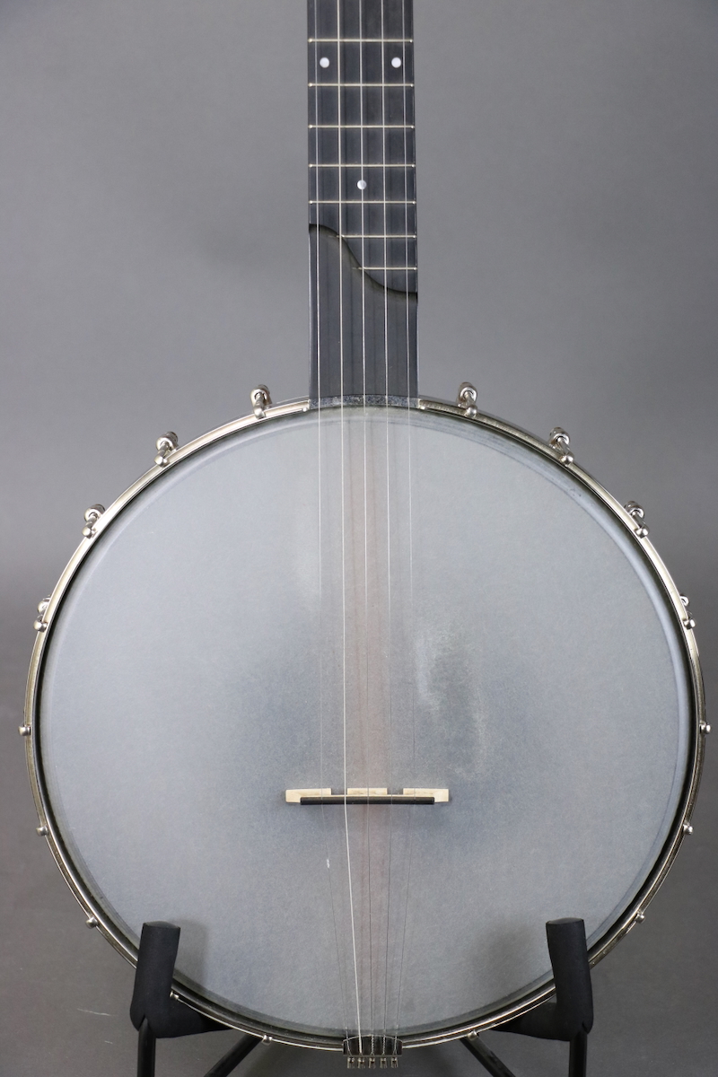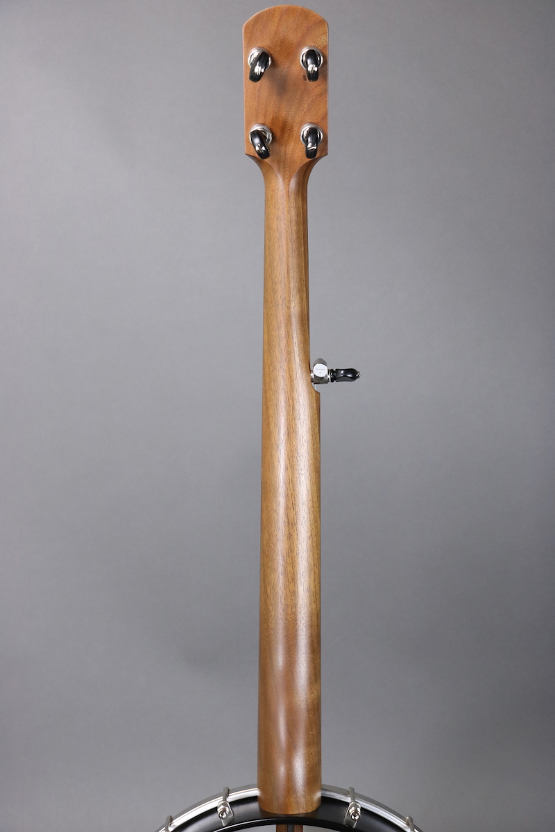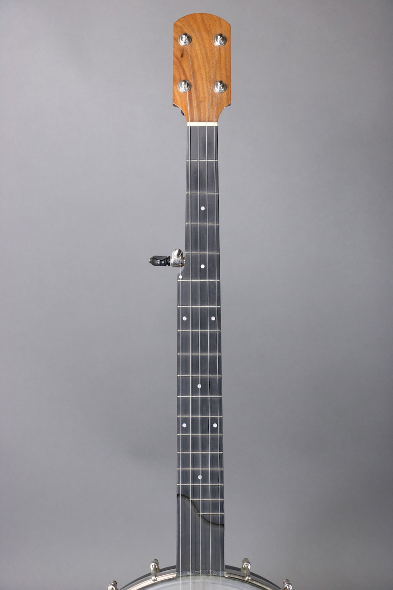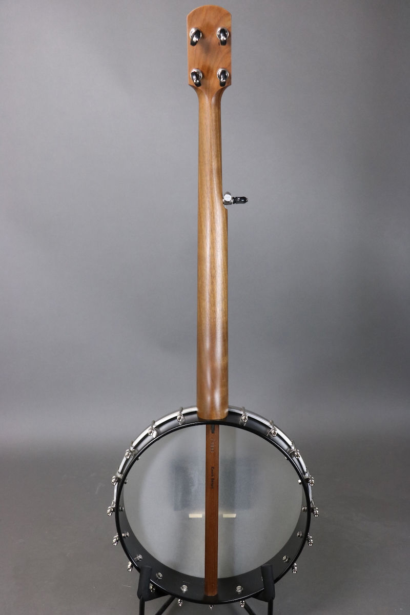The Enoch Tradesman features a multi-ply 12” maple rim with black finish (no tone ring), walnut neck with “Dobson style” profile & adjustable truss rod, 18-bracket grooved tension hoop, No-Knot tailpiece, nickel hardware, Remo Renaissance head, Richlite fingerboard, and geared Gotoh tuners with black buttons. This banjo is in great condition, with negligible fret wear. Comes in a gig bag.