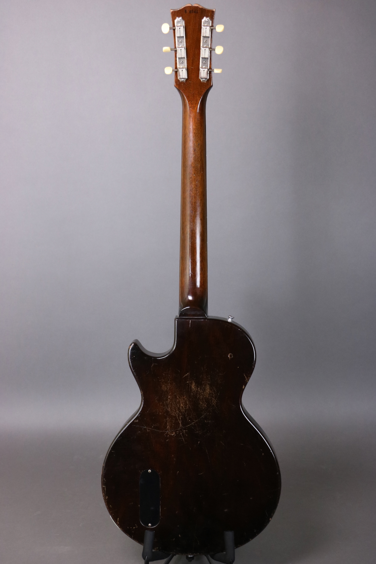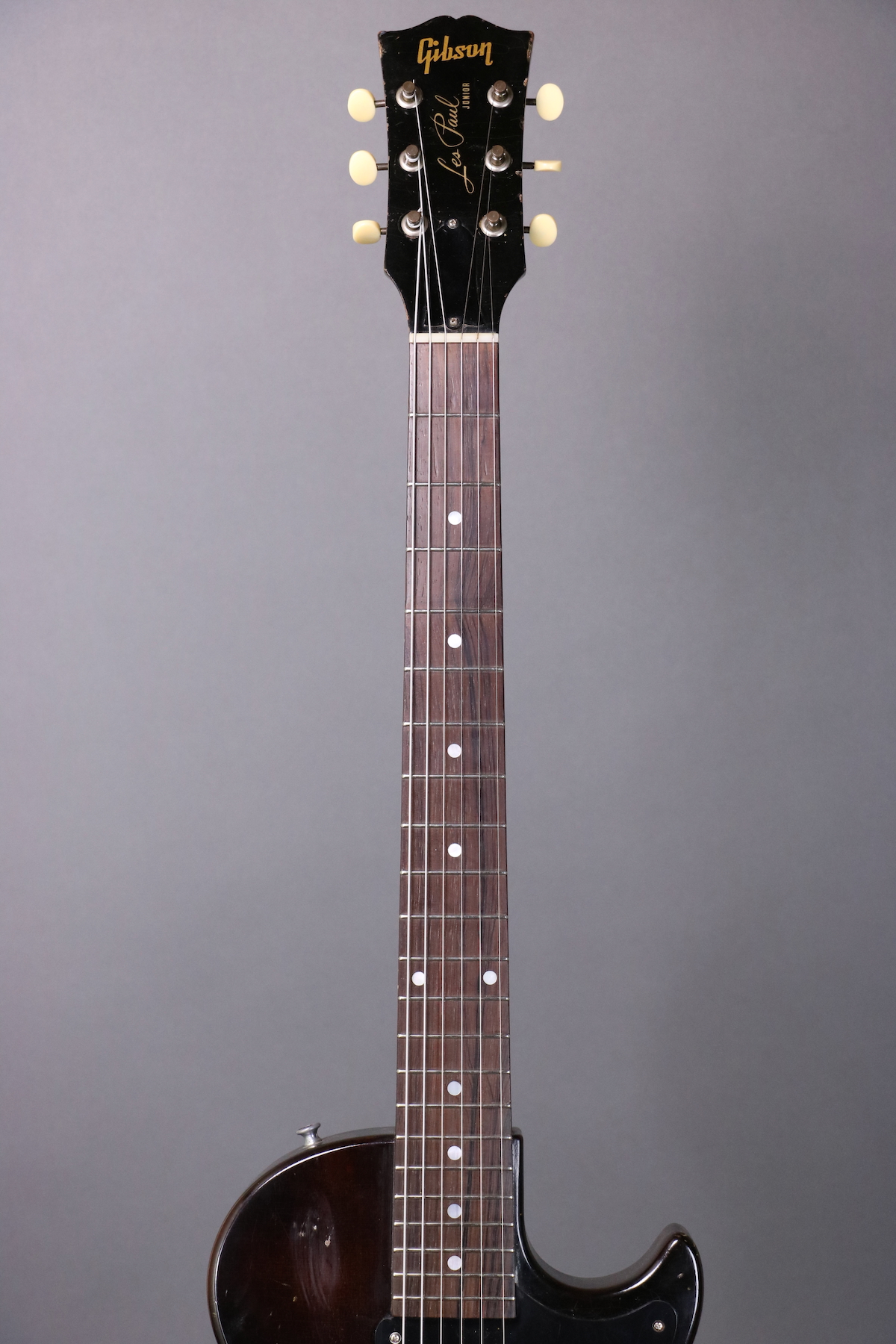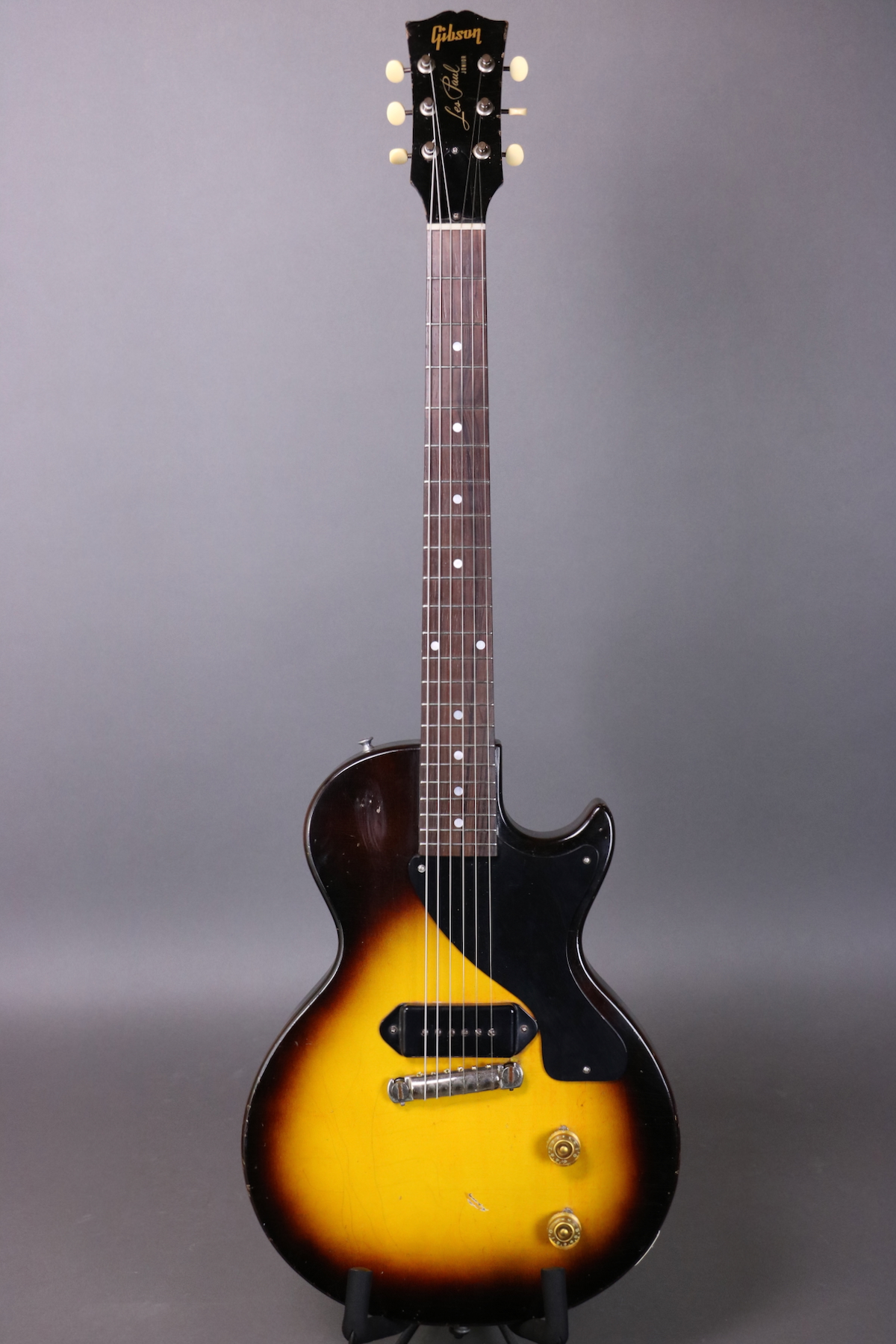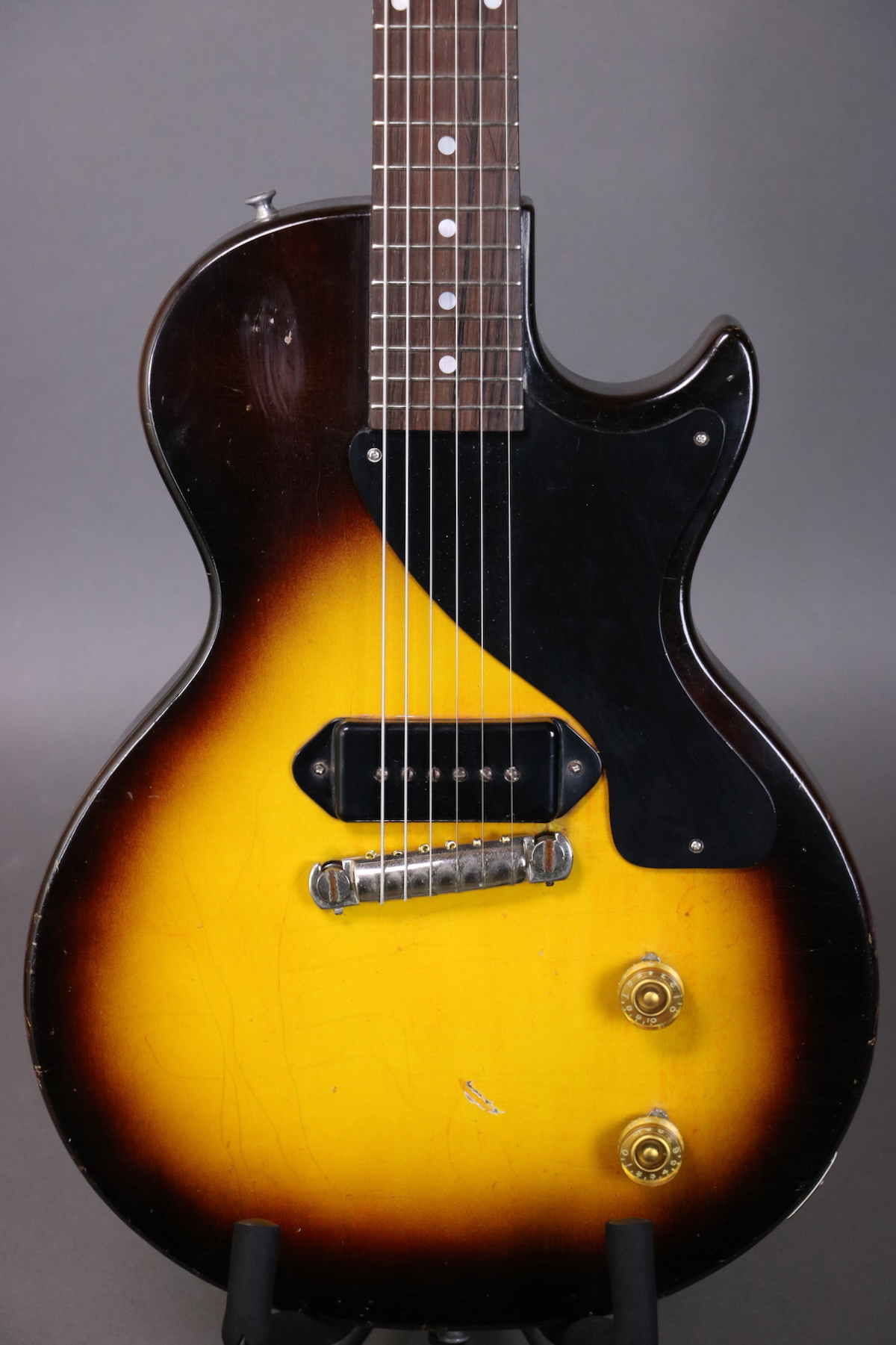 This ’55 Les Paul Junior is an absolute rock machine- a fine example that seems to come to life when you plug it in and roll up the volume. It sports the original finish, pickguard, tailpiece, pickup, pickup cover, and wiring harness. The only disturbed solder joint appears to be a touched up ground wire; the pots and cap are both original to the guitar. The only replacement parts are the speed knobs; we put new buttons on the original tuning machines and reinstalled them (there are some extra holes that are covered up by the tuners). Comes in a hardshell case.