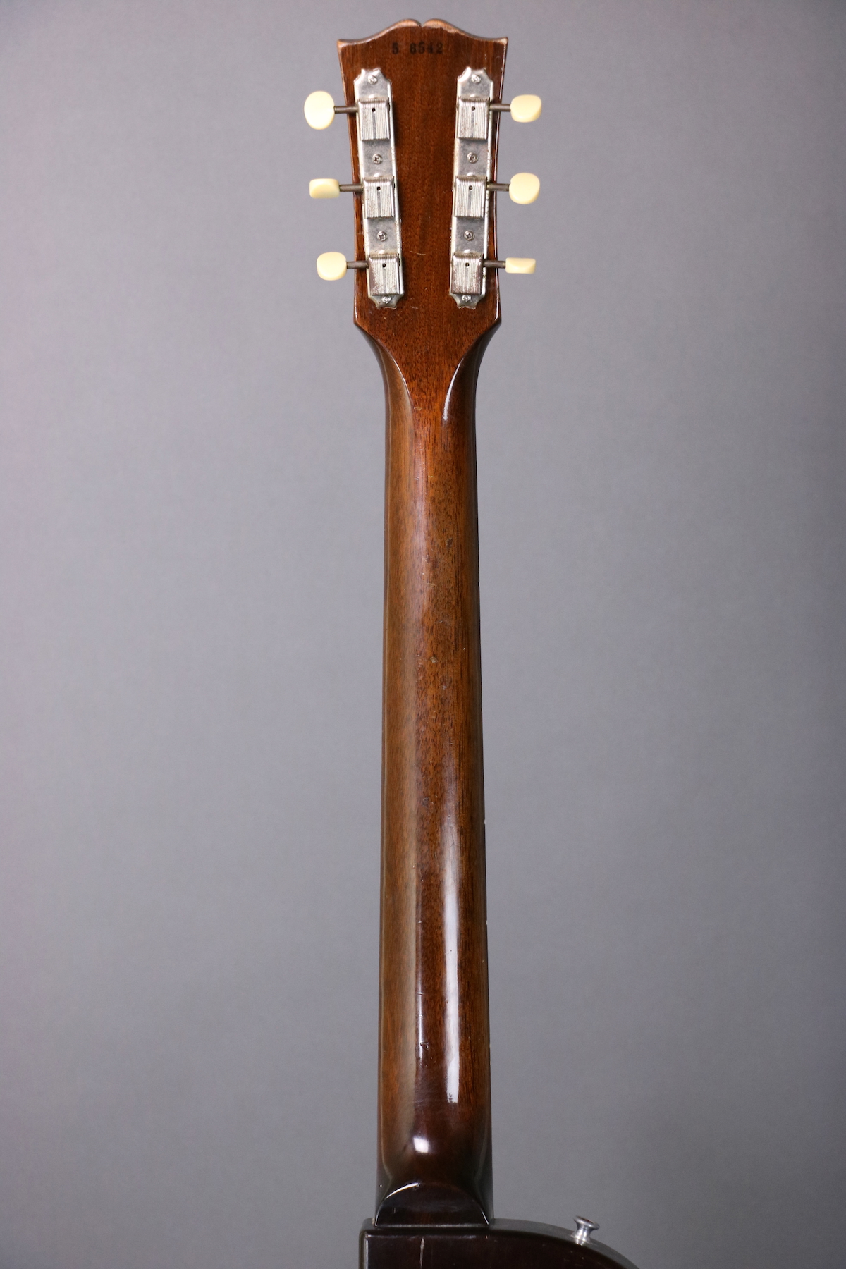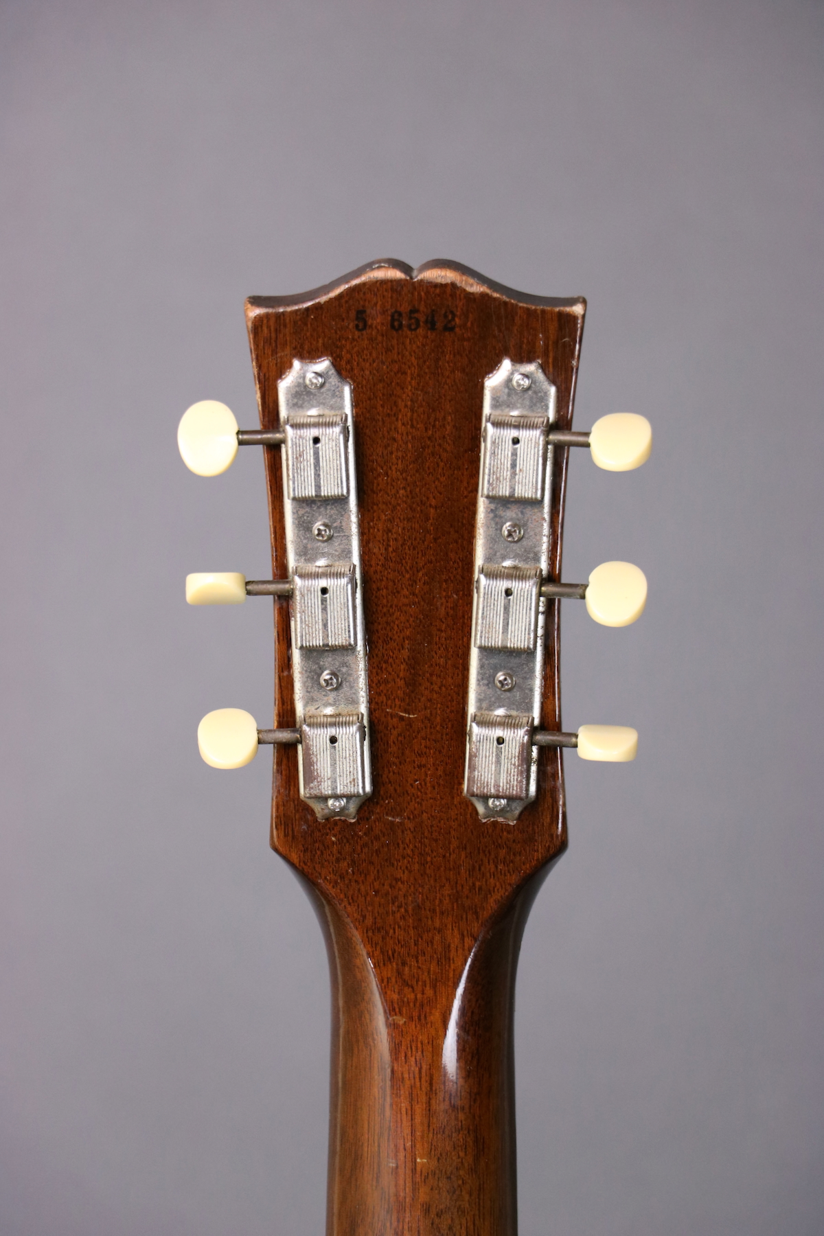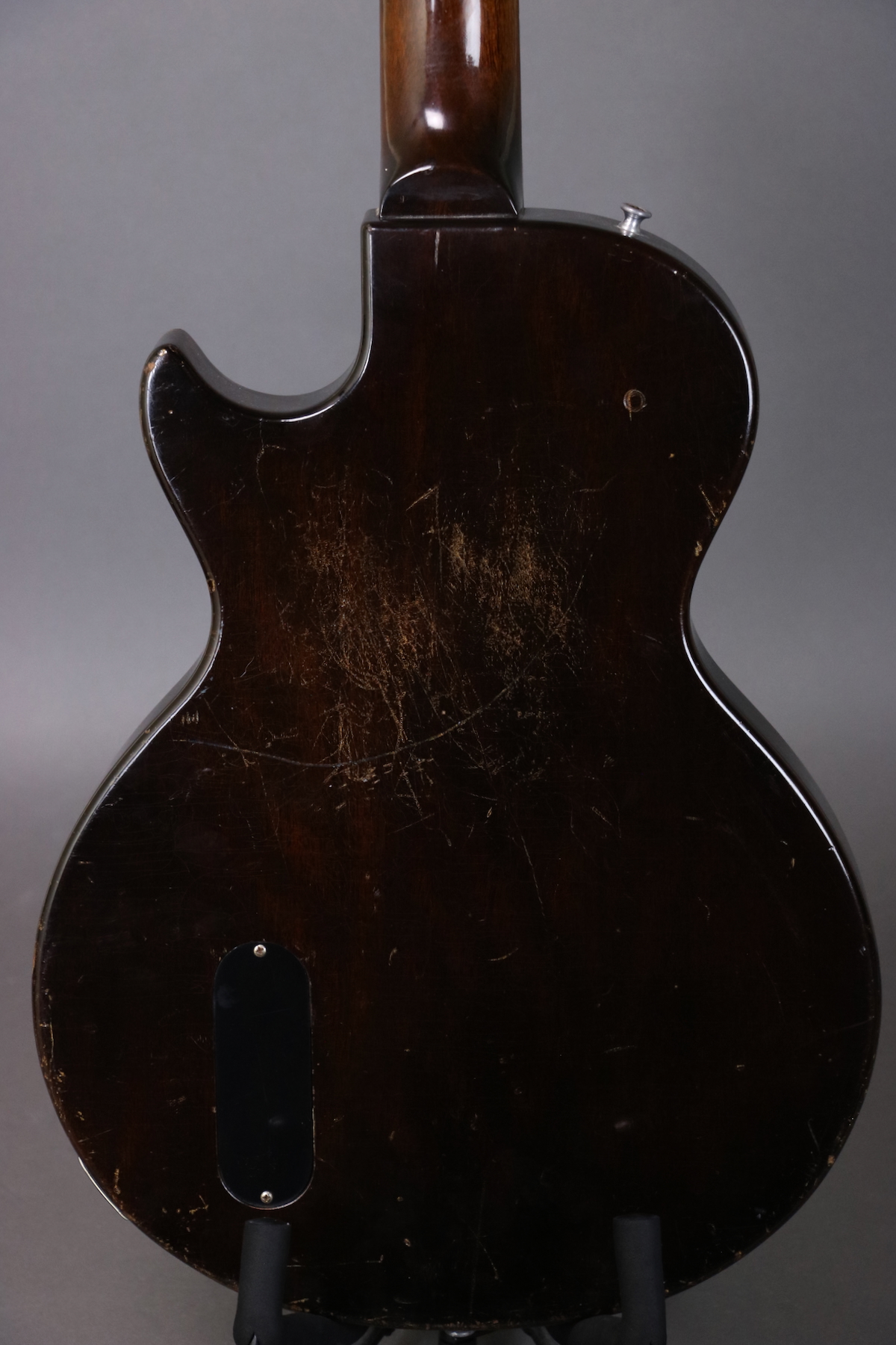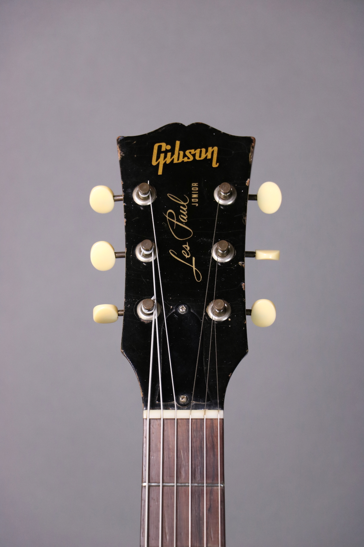 This ’55 Les Paul Junior is an absolute rock machine- a fine example that seems to come to life when you plug it in and roll up the volume. It sports the original finish, pickguard, tailpiece, pickup, pickup cover, and wiring harness. The only disturbed solder joint appears to be a touched up ground wire; the pots and cap are both original to the guitar. The only replacement parts are the speed knobs; we put new buttons on the original tuning machines and reinstalled them (there are some extra holes that are covered up by the tuners). Comes in a hardshell case.