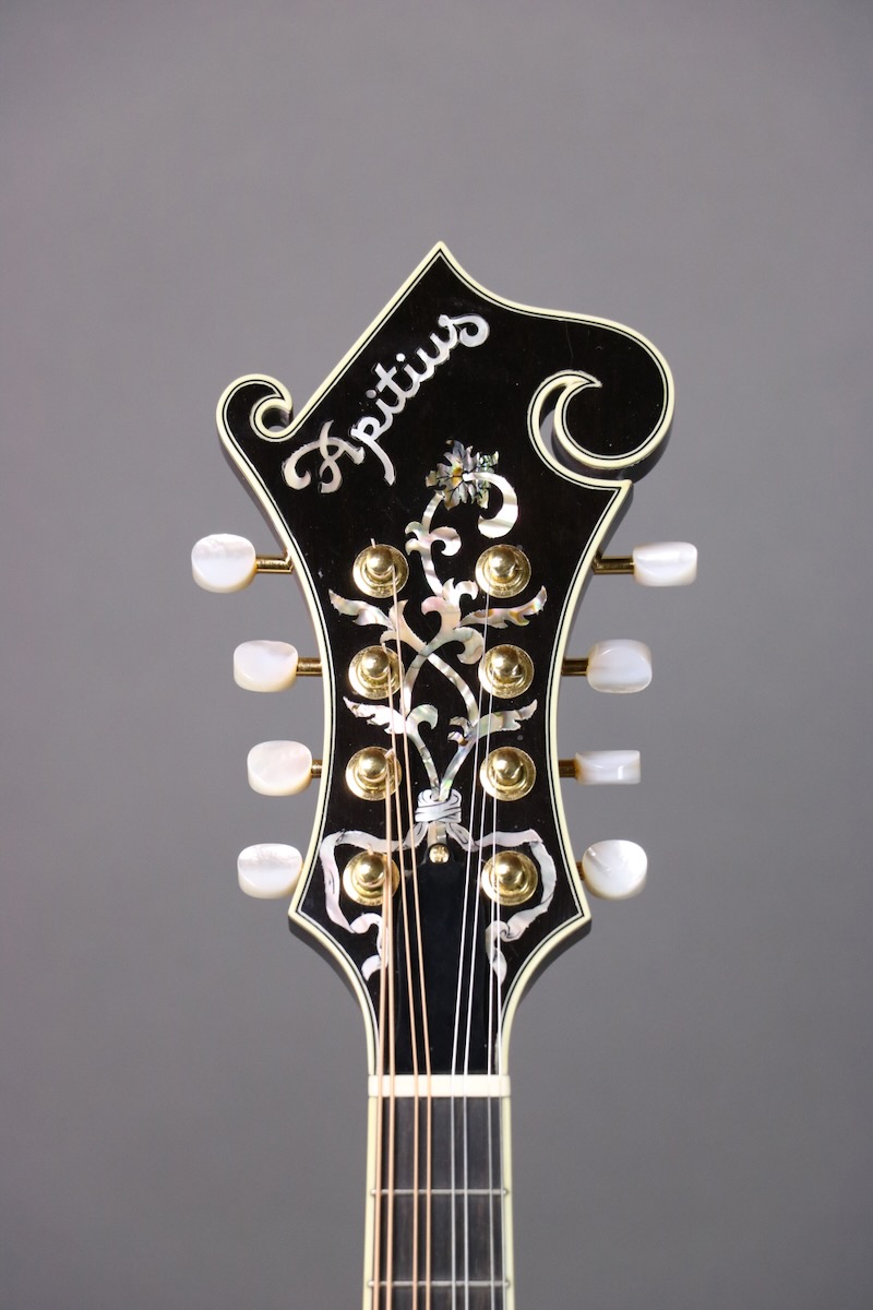 Oliver Apitius is a well-regarded mandolin builder with quite a long wait list these days. This “Grand Classic” model features more ornamentation than other offerings from Apitius, including invoriod/black/white bindings on the body, neck & headstock, paua abalone position markers, and the “Apitius Vine” headstock inlay. Other features include a hand-carved spruce top, beautifully matched figured maple back & sides, figured maple neck, ebony fingerboard with compound radius, 1 5/32” nut width, hide glue construction, hand-applied spirit varnish finish, and gold open-gear tuners. This particular mandolin was ordered without a pickguard, and the engraved tailpiece was swapped in favor of a hinged tailpiece